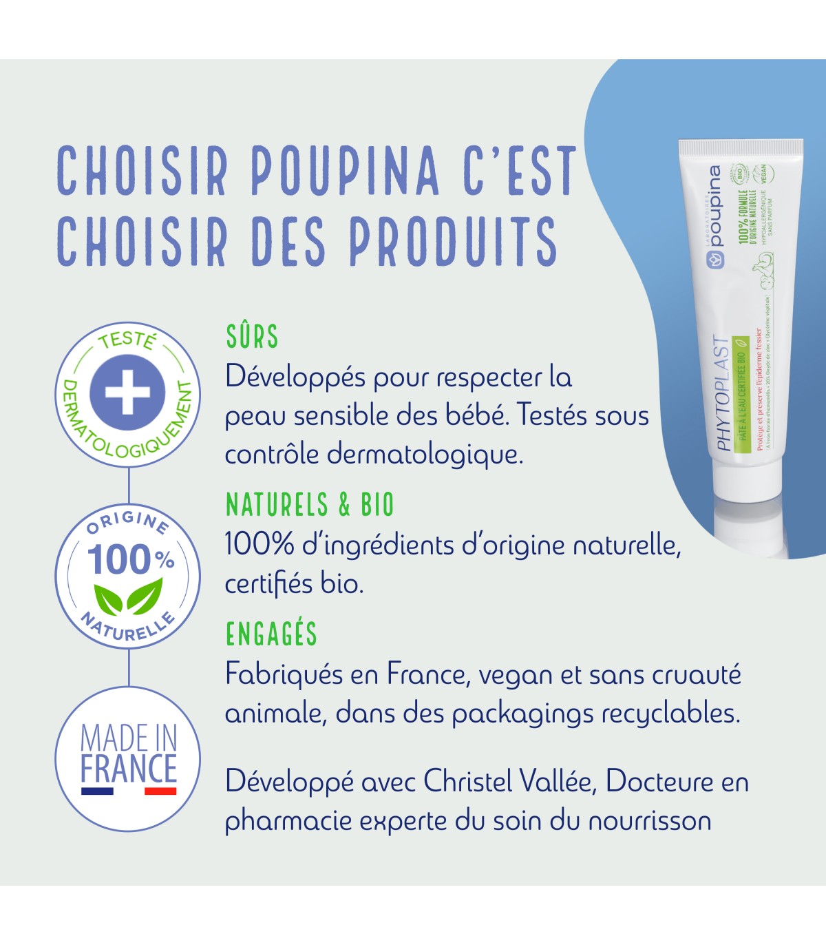 « Afin de réparer et de soulager au mieux les rougeurs et irritations du siège du bébé, Poupina a créé une formule efficace en s'inspirant des formulations présentent dans la pharmacopée. »