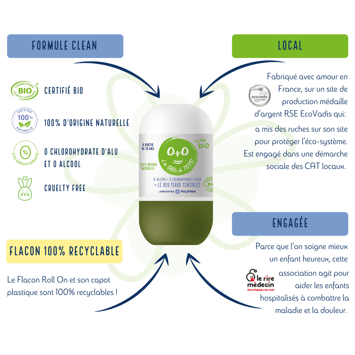 • 100% naturel et certifié bio. 0 ingrédients de synthèse, 0 alcool et 0 chlorohydrate d’alu.