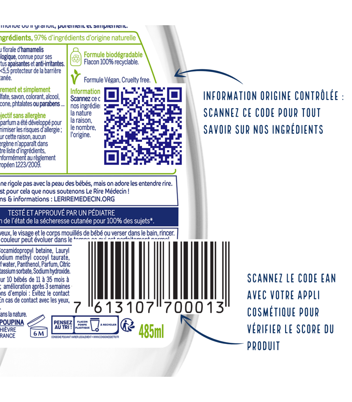 Avec seulement 12 ingrédients, 97% d’ingrédients d’origine naturelle, de l’eau florale d’Hamamélis biologique cultivée en France, et son parfum tout doux, il a été formulé avec un objectif zéro allergènes. Sans sulfate, savon, colorant, alcool, silicone, phtalates ou paraben. Formule Vegan, cruelty free. Il est noté 93/100 sur l'application Yuka.